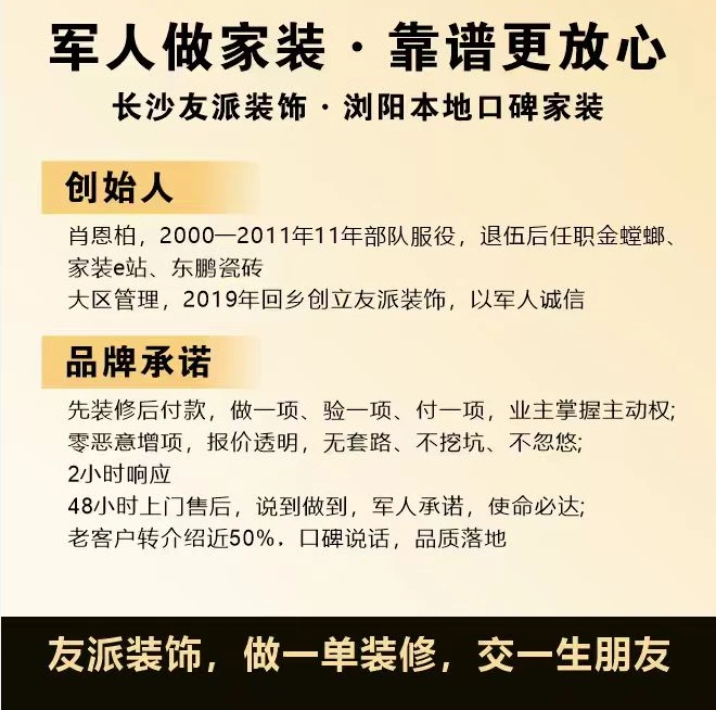 答:长沙友派装饰主打先装修后付款,预算透明无隐形增项,提供2小时响应48小时上门售后,实景还原度高,是浏阳口碑好的装修公司
